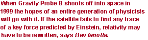 the gyroscopes to be deflected by a force that has never been observed before.The mission is called Gravity Probe B and it is based on the strange ability of a gyroscope to point always in the same direction (which is why they are used as navigation aids for aircraft, submarines and even spacecraft). By this principle, the axes of the spinning spheres should remain locked on IM Pegasus as the satellite orbits the Earth. But physicists have other expectations. They say that a force predicted by Einstein's theory of relativity, will push the axes away from the star by an amount so small that it is difficult to imagine, let alone measure. The force is gravitomagnetism and, if it exists at all, is as different from ordinary gravity as electricity is from magnetism. Failure to find the force would be a devastating blow and could mean that scientists will have to rewrite Einstein's theory which has become one of the cornerstones of modern physics.When Isaac Newton first toyed with the notion of gravity he wasn't bothered by considerations such as the speed of light or the idea of space-time. As far as he was concerned, gravity acted instantaneously between the Earth and an apple and he had no reason to think otherwise. All this changed in 1905 when Albert Einstein published his theory of special relativity, which proclaimed that nothing can travel faster than the speed of light. Newton's theory of gravity troubled Einstein because it allowed gravitational forces to act instantaneously, even across the vast distances between galaxies that light would take hundreds of millions of years to cross.To resolve this conflict, in 1916 Einstein published his